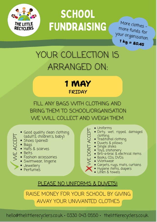 | Fundraiser - Clothing Collection | Friday 1st May | See poster for more information |